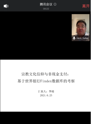 2021年6月25日,复旦大学李楠教授应中财经济史系邀请,使用腾讯会议在线开展了主题为“宗教文化信仰与非现金支付:基于世界银行Findex数据库的考察”的讲座,本次讲座于下午2点在线举行,持续近3个小时。讲座由开云kaiyun官方网站兰日旭教授主持,开云kaiyun官方网站金星晔老师以及开云官网经济史系硕博同学参加了此次讲座。