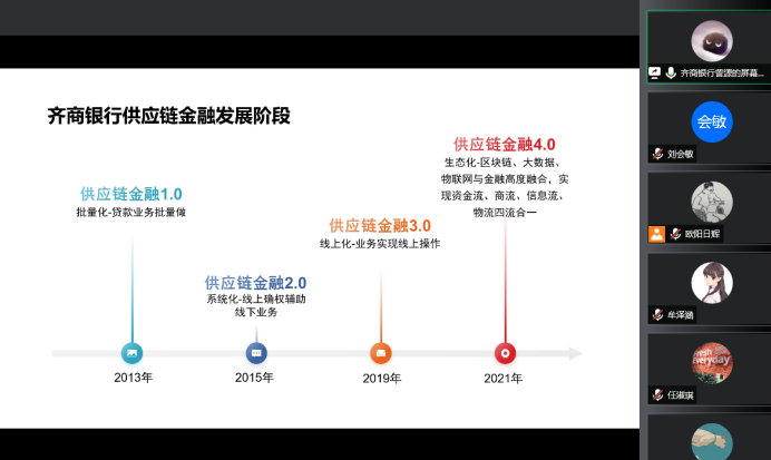 本次讲座主要分为两部分。首先,訾总对供应链金融及其发展阶段、供应链金融的主要模式、供应链金融的政策变迁等进行介绍,并结合齐商银行发展供应链金融的实践,从产品、技术、平台和模式的角度进行了颇为细致的讲解,最后对数字供应链金融未来的生态化发展趋势进行了展望。齐商银行供应链金融业务的数字化转型走在了行业前列,通过区块链、大数据、物联网等金融科技的应用构建金融生态,借助在线供应链平台、物流平台和账户体系的有机整合,使供应链金融服务嵌入交易、物流、融资等供应链各个流程环节中,为核心企业上下游供应链的不同节点提供“金融+IT+物流+运营”等的一站式综合服务,逐步完成了从自建场景、嵌入场景到输出场景等不同交易场景的发展过渡,实现了资金流、商流、信息流、物流的四流合一,使金融更加高效地服务实体经济。訾总的生动讲解为同学们了解数字供应链金融行业前沿知识提供了宝贵的机会,也为同学们未来在数字供应链金融理论和实践中的应用提供了思路借鉴,同学们收获满满。接着,由三位国际商务专业的硕士生同学和一位互联网经济学专业的博士生同学分享了“数字供应链金融”领域的相关文献,訾总对同学们分享的文献做了简要点评,并结合公司自身业务补充了相关内容。