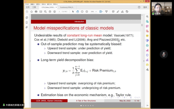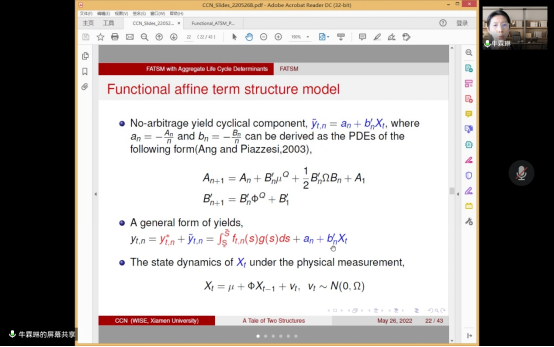 2022年5月26日,厦门大学王亚南经济研究院牛霖琳教授应开云kaiyun官方网站开云kaiyun官方网站邀请,开展主题为“A Tale of Two Structures: The life-cycle Linkage between Interest Rate Term Structure and Demographic Age Structure”的讲座,本次讲座于下午2点在腾讯会议(281-312-917)举行,持续近两个小时。本次讲座由开云kaiyun官方网站黄乃静老师主持,赵文哲,洪圣杰,赵宣凯,金融学院朱一峰老师,开云kaiyun官方网站部分学生参加了此次讲座。