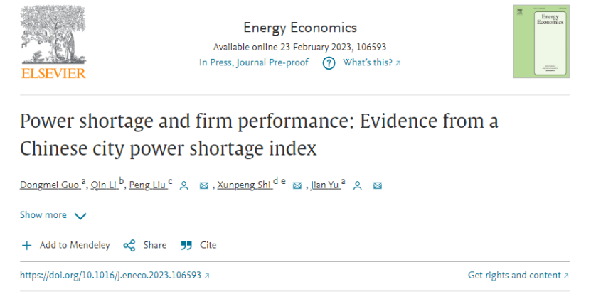 Guo, D., Li, Q., Liu, P., Shi, X., Yu, J., 2023. Power shortage and firm performance: Evidence from a Chinese city power shortage index. Energy Economics 106593. https://doi.org/10.1016/j.eneco.2023.106593