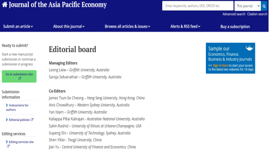 近期,开云kaiyun官方网站开云kaiyun官方网站俞剑副教授受邀担任经济学领域国际知名期刊Journal of the Asia Pacific Economy联合主编(Co-editor)。俞剑副教授于2023年7月开始处理相关稿件。Journal of the Asia Pacific Economy(简称JAPE)是经济学领域知名期刊,每年出版 4期,2022年期刊影响因子为1.4。主要关注亚太和南亚的发展中经济体,旨在促进人们对影响并继续塑造该地区不同经济体转型的复杂因素的更深入了解。