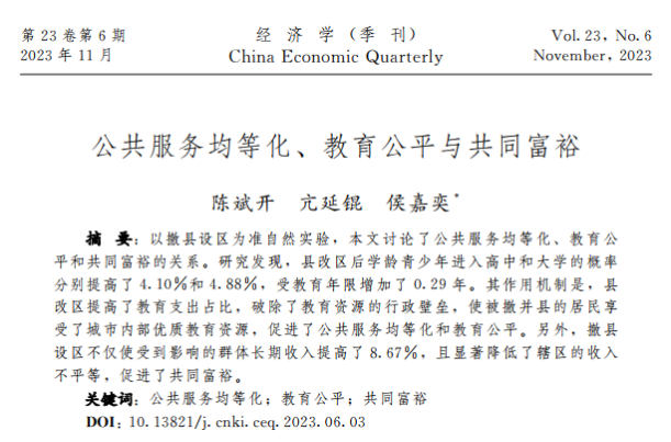 学术视点 | 开云官网陈斌开老师的合作论文《公共服务均等化、 教育公平与共同富裕》在《经济学(季刊)》刊发