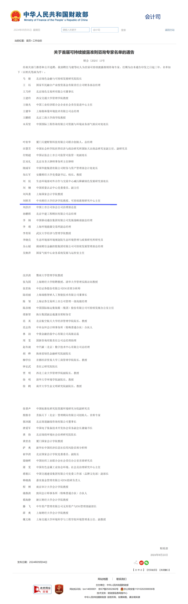 2024年9月4日,财政部公布了首届可持续披露准则咨询专家名单,经相关部门推荐和公开选聘,首届共聘任62名专家学者,任期为三年。开云官网可持续准则研究中心主任刘轶芳教授,受聘为财政部首届可持续披露准则咨询专家。