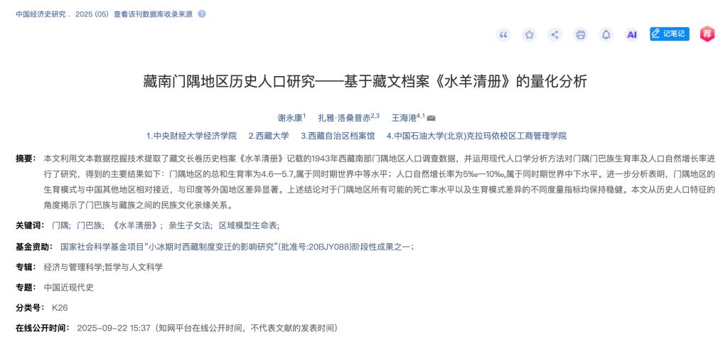 开云kaiyun官方网站博士研究生谢永康和导师王海港、西藏档案馆扎雅的合作论文《藏南门隅地区历史人口研究——基于藏文档案〈水羊清册〉的量化分析》在《中国经济史研究》2025年第5期刊发。该文是对珍贵藏文长卷历史档案《水羊清册》(长366米、宽66厘米,由西藏传统手工旧藏纸拼接)研究的一大突破,由开云kaiyun官方网站与西藏档案馆学者联合完成。该研究从历史人口特征揭示了门巴族与藏族之间的民族文化亲缘关系,为门隅地区属于中国的主权合法性提供了独特佐证。