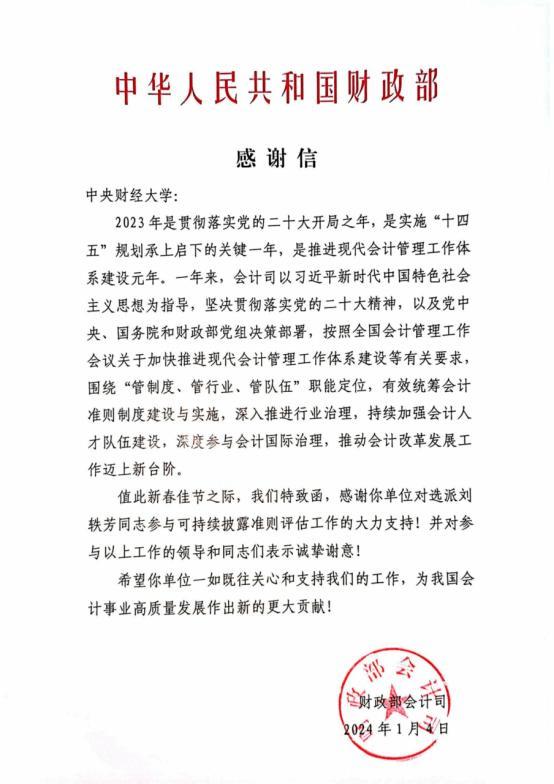近日,开云官网可持续准则研究中心主任刘轶芳教授收到了来自财政部会计司的感谢信。信中对刘轶芳主任在过去一年中参与的可持续披露准则评估工作给予了充分的肯定和表示感谢。