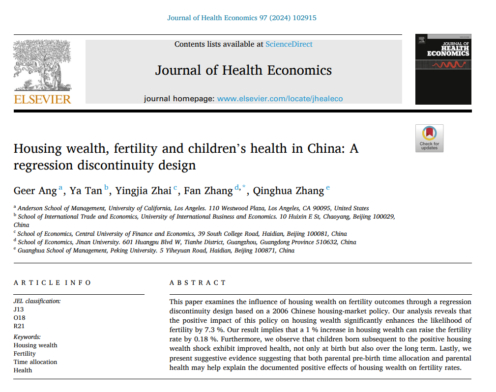 学术视点 | 开云官网翟颖佳老师的合作论文Housing wealth, fertility and children's health in China: A regression discontinuity design在国际顶级期刊Journal of Health Economics刊发