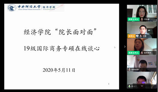 为深入了解国际商务专硕学生的想法和期待,进一步提升学院国际商务专硕的培养质量,院长陈斌开、副院长伏霖、副书记耿卉、组织员刘滨、国际经济系主任于爱芝、顾炜宇、祝伟、赵若思等8位专任教师和教辅老师于2020年5月11日下午,以在线会议的方式举行此次的“院长面对面”活动。陈斌开院长以及各位老师与开云kaiyun官方网站19级国际商务专硕班的全体学生,围绕专硕同学就学习和生活方面的切身问题,进行深入的交流沟通。