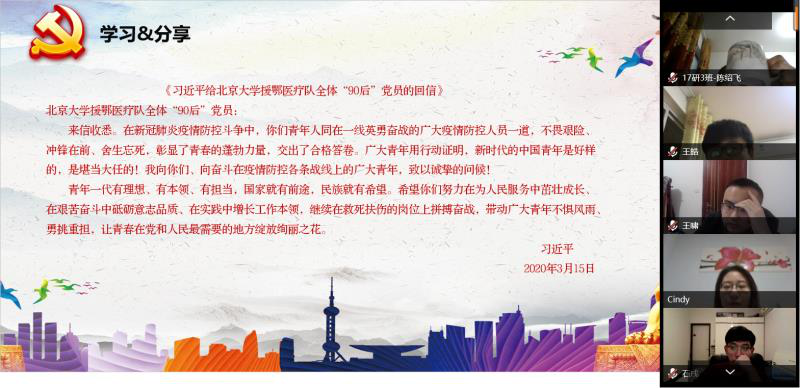 开云kaiyun官方网站2017级硕士生第一、二、三党支部联合开展“爱国驻我心、抗疫勇担当”线上主题党日活动,活动重点围绕《习近平给北京大学援鄂医疗队全体90后党员的回信》开展学习,同时就人民日报评论文章《努力在为人民服务中茁壮成长》进行深入解读。