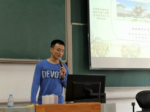 宣讲会伊始,主持人刘乐首先对新生同学的到来表示热烈欢迎,并祝福新生们有个丰富多彩的研究生生活。接着他通过照片的形式分别展示了2017-2018学年所办过的各项活动,以活动带部门,向同学们介绍了学实部、组织部、文体部、宣传部、办公室、外联部、职规部七个部门的工作内容及去年一年的工作成果,其中比较具有代表性的有中信证券大讲堂系列讲座、“唱响中华复兴梦想”研究生红歌大赛第二名、“龙马青研最强音”系列活动最佳组织奖及“中研杯”篮球赛亚军等。在研究生会各部门的齐心努力下,让17级研究生们收获到更多的学习资源,也使他们的课后生活更加丰富多彩。