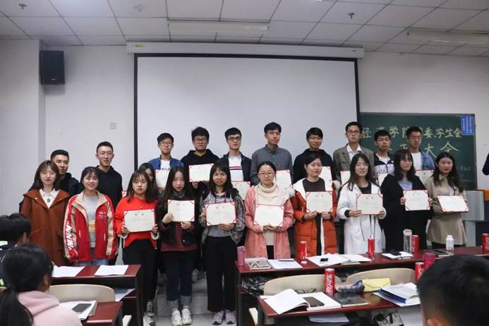 接下来是聘书颁发环节。首先由团委书记李倩老师向主席团颁发聘书,接下来新任主席团向各部门部长副部长颁发聘书,并合影留念。紧接着各部门依次汇报了工作成果、对未来工作的规划以及对新成员的期望和要求。
