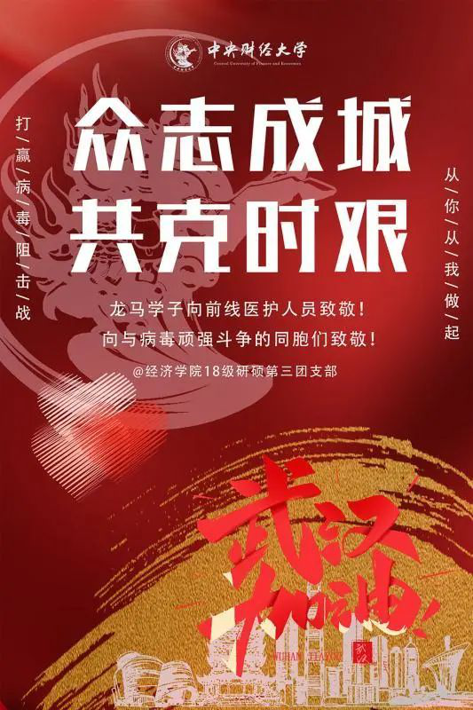 支部制作了“众志成城,共克时艰”主题海报,向前线医护人员和与病毒作斗争中的同胞们致敬。另外在支部内开展“三行情诗”战疫活动,内容涵盖对疫情社情的思考、对疫情防控阻击战中涌现出的先进典型的感悟、为一线医务人员与亲戚朋友的加油祝福、在家学习的收获、和家人之间发生的趣事等等。以“三行情诗”这种简短且灵活的形式充分调动支部成员的积极性,尽可能多的提高支部成员共同抗疫的积极性和参与度,传递中财大青年的正能量。