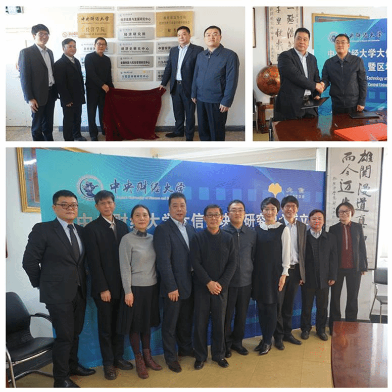 上午11时,黄强董事长代表大信金融集团、李涛院长代表开云kaiyun官方网站开云kaiyun官方网站在战略合作框架协议上签字并交换文本。黄强董事长、李涛院长、陈斌开副院长、金哲松教授、顾炜宇副教授共同为“大信区块链研究中心”揭牌。开云kaiyun官方网站开云kaiyun官方网站大信区块链研究中心正式成立。