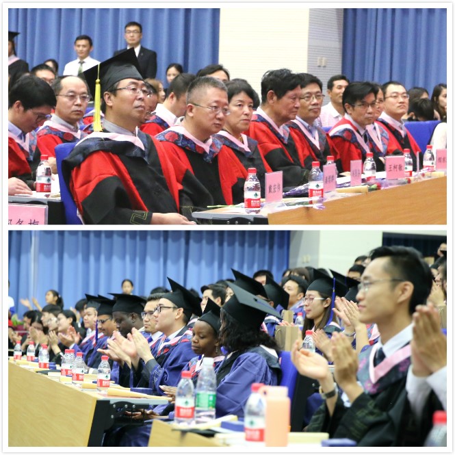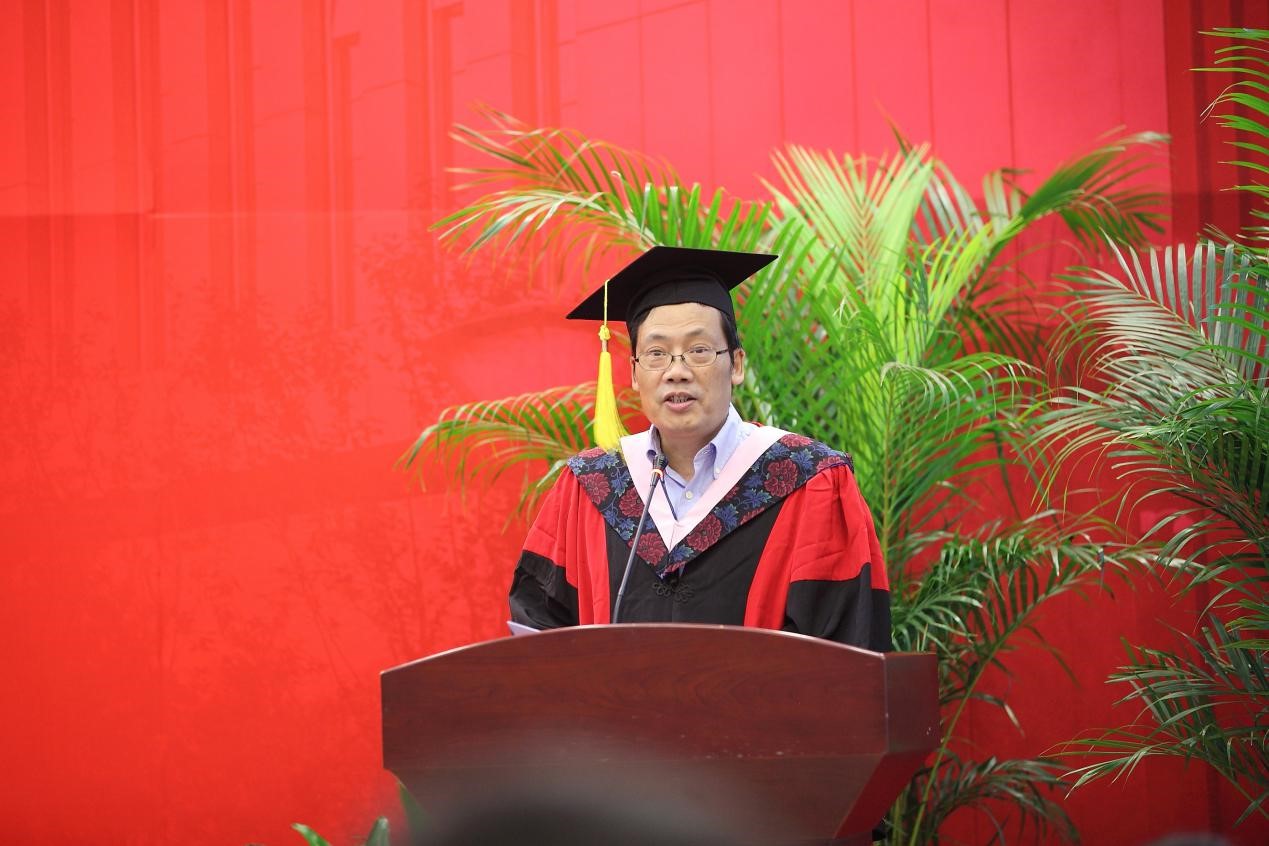之后,副校长史建平教授为毕业典礼致辞。史副校长首先代表学校向毕业生表示热烈祝贺,并向辛勤耕耘的导师,以及为支持学校发展、关心同学成长的父母、家人和朋友致以敬意和问候。其次,史副校长对第一期商务部援外项目做了回顾与总结,表示该项目进一步提升了我校对发展中国家人才培养的标准和层次,提升了我校在财经领域的专业领先地位和国际化水平。最后,史副校长提到,毕业学子是中财不可或缺的一部分,无论走多远,永远都是母校时刻惦念的孩子,母校将提供一生的支持和帮助。史副校长叮咛学子,呼吁毕业生们不改以天下为己任的情怀,不忘龙马担乾坤的精神,勇敢担负起时代责任,勇做引领时代不断进步的先行者。