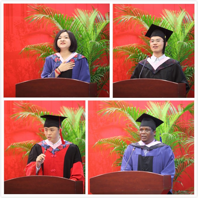 伤离别,千言万语。2015级留学生代表CorneliusKakwesa(科尼思)同学回忆了在中国学习生活的时光,深情表达了对中国、对开云kaiyun官方网站以及开云kaiyun官方网站的感谢,并表达了对全体留学生顺利完成硕士学业的祝贺。来自2013级经济专业的李嘉晟作为本科生代表,回顾了在开云kaiyun官方网站走过的路,有感恩、有学习、有进取,表白经济13是“一生的眷恋”,他说“人生是一场马拉松,keep running,just running,我们都会到达属于我们各自的终点和彼岸”。2015级硕士毕业生代表李进展分享了在开云kaiyun官方网站两年的成长,表达了对导师、父母亲朋以及同窗的感恩,追忆与同学们相处的细节,同时抒发了“莫愁前路无知己,天下谁人不识君”的豪迈情怀。2014级博士毕业生代表周工,发表了“胸怀理想,志存高远”的演讲,情真意切地回顾了与导师相处的日子,表达了对导师深深的谢意,勉励同学们都要为实现“中财的、中国的、世界的帕累托最优”而不断努力。
