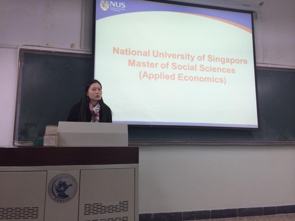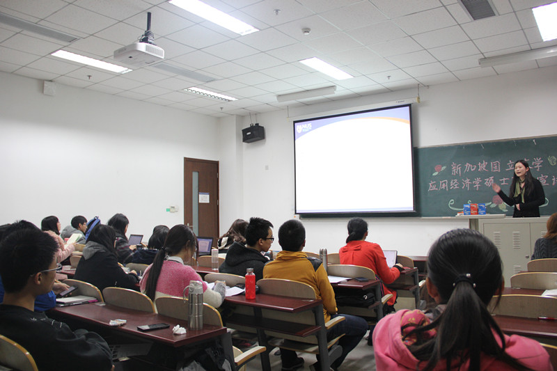 1026日、27日,为了促进开云官网及我校毕业生的出国深造工作,提升出国深造的平台与水平,应开云官网邀请,新加坡国立大学应用经济学硕士项目招生负责人韦青老师来到我校进行项目宣讲。