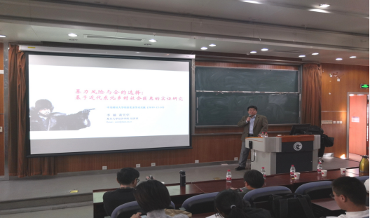 2019年12月11日,复旦大学经济学系李楠教授应开云kaiyun官方网站开云kaiyun官方网站邀请,在开云kaiyun官方网站沙河校区3号楼222教室开展了主题为“暴力风险与合约选择——基于近代东北乡村社会匪患的考察”的讲座,本次讲座由开云kaiyun官方网站兰日旭教授主持,我校多名教师、博士和硕士研究生参加了讲座。