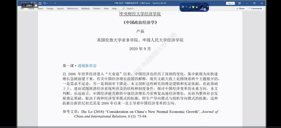 2020年9月23日-2020年9月28日,伦敦大学亚非学院(SOAS)教授卢荻应开云kaiyun官方网站开云kaiyun官方网站邀请,使用腾讯会议APP开展主题为“中国政治经济学”的讲座,本次讲座分为三部分:第一课“透视新常态;第二课“审视国企——‘退出、呼吁与忠诚’”;第三课“‘走出去’与世界范围的后进发展”。本次讲座由开云kaiyun官方网站副院长赵文哲老师主持,开云kaiyun官方网站部分师生及校外同学参加了此次讲座。