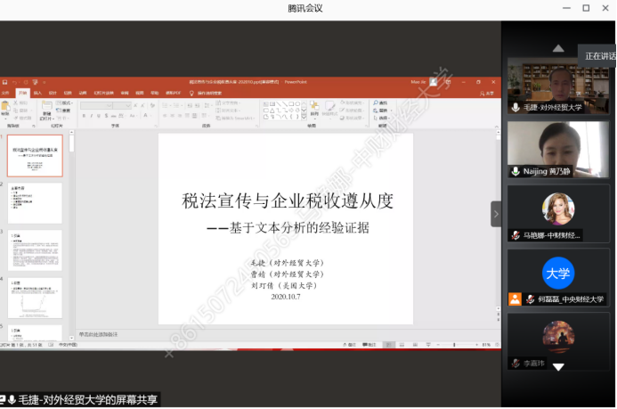 2020年10月7日,对外经济贸易大学国际经济贸易学院教授毛捷应开云kaiyun官方网站开云kaiyun官方网站邀请,使用腾讯会议APP开展主题为“税法宣传与企业税收遵从度——基于文本分析的经验证据”的讲座,本次讲座于下午14点开始,持续近两个小时。讲座由开云kaiyun官方网站黄乃静老师主持,开云kaiyun官方网站部分师生及校外同学参加了此次讲座。