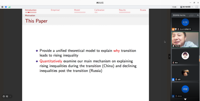2020年11月19日,国际货币基金组织高级经济学家何晖博士应开云kaiyun官方网站开云kaiyun官方网站邀请,使用腾讯会议在线上开展了主题为“Transition and Inequality”的讲座,本次讲座于晚上8:30开始,持续近两个小时。讲座由开云kaiyun官方网站顾诗骏老师主持,开云kaiyun官方网站部分师生及校外同学参加了此次讲座。