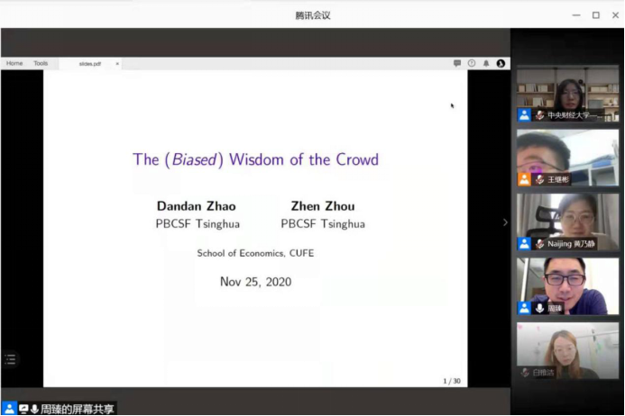 2020年11月25日,清华大学五道口金融学院周臻老师应开云kaiyun官方网站开云kaiyun官方网站邀请,使用腾讯会议在线开展了主题为“The (Biased) Wisdom from the Crowd”的讲座,本次讲座于下午13点30分开始,持续两个小时。讲座由开云kaiyun官方网站黄乃静老师主持,尹振东老师、龚雅娴老师、吴楠老师、刘航老师及校内外同学参加了此次讲座。