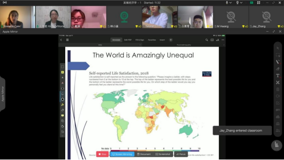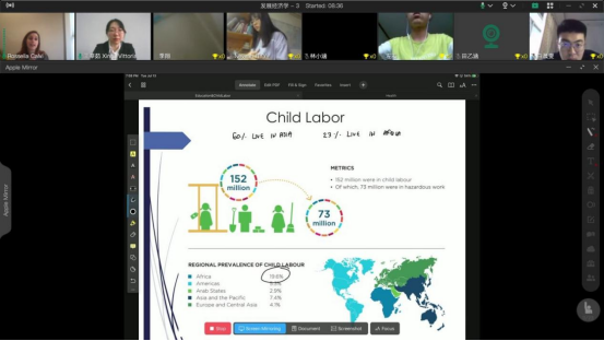 在交流环节,师生纷纷就“性别不平等”、“贫穷和不平等”、“教育投资”、“童工”等问题与Rossella老师进行了积极思考和热烈讨论。课程中,Rossella老师耐心地解答了师生们的问题,而且还分享了她研究课题时遇到的各国文化差异。线上课程气氛活跃,参与的师生都表示受益匪浅。