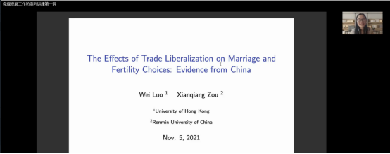 2021年11月5日下午,开云kaiyun官方网站微观发展工作坊系列讲座第一讲在线上顺利举行。本次讲座的主题是贸易自由化对婚姻和生育选择的影响,由香港大学经管学院博士后研究员罗唯老师主讲,我校开云kaiyun官方网站的赵文哲老师、胡志安老师、梁银鹤老师、徐竹烽老师以及中国人民大学劳动人事学院的邹先强老师参与了讲座。