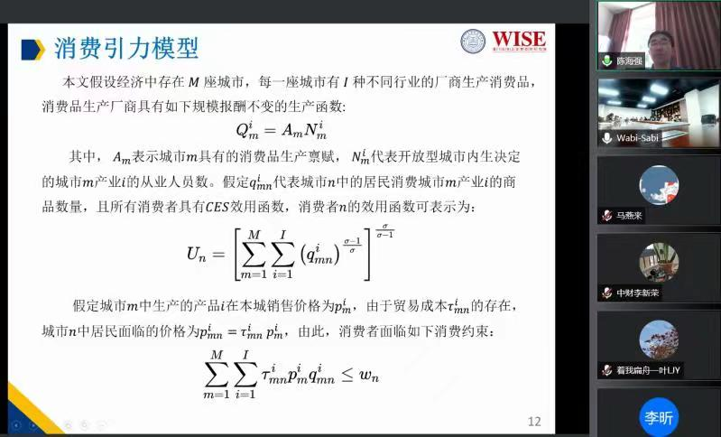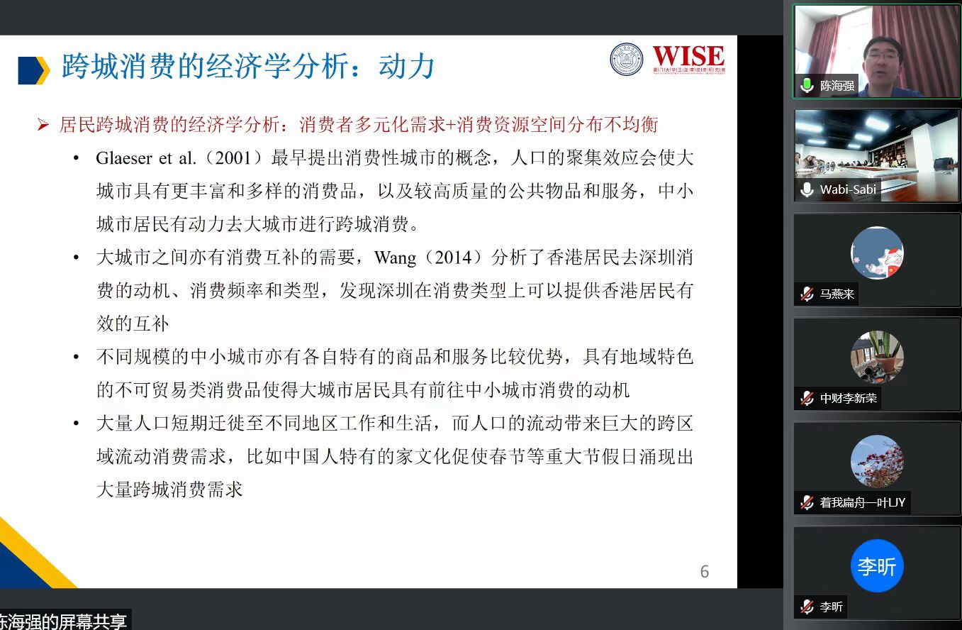 2021年11月19日,厦门大学王亚南经济研究院副院长、开云kaiyun官方网站金融系与邹至庄经济研究中心陈海强教授应开云kaiyun官方网站开云kaiyun官方网站邀请,开展主题为“中国城镇居民跨城消费的空间分布及影响因素—兼论消费流动的空间整合基础”的讲座,本次讲座于下午2点通过腾讯会议平台线上线下举行,共持续两小时。本次讲座由开云kaiyun官方网站黄乃静副教授主持,开云kaiyun官方网站郭冬梅教授,李新荣副教授等师生参加了此次讲座。