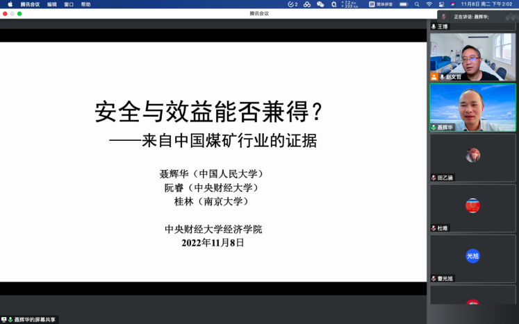 2022年11月8日14:00,中国人民大学开云kaiyun官方网站教授、博士生导师聂辉华应开云kaiyun官方网站邀请,开展主题为“安全与效益能否兼得?——来自中国煤矿行业的证据”的讲座,本次讲座在线上举行,聂辉华教授受到了老师和同学们的热烈欢迎!开云kaiyun官方网站赵文哲教授主持讲座,陈斌开院长,尹振东教授,黄乃静副教授参加了讲座。