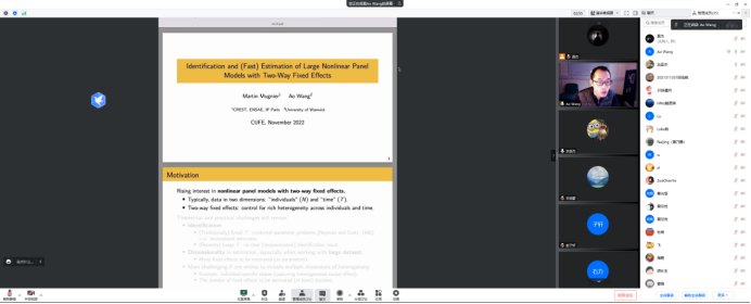 2022年11月24日16:30,华威大学经济学助理教授,华威大学全球经济竞争优势研究中心(CAGE)副研究员王骜(Ao Wang)应开云kaiyun官方网站邀请,进行了主题为“Identification and (Fast) Estimation of Large Nonlinear Panel Models with Two-Way Fixed Effects”的讲座。本次讲座在线上进行。王骜教授受到了开云kaiyun官方网站老师与同学们的热烈欢迎。开云kaiyun官方网站洪圣杰副教授主持讲座,黄乃静副教授参加了讲座。
