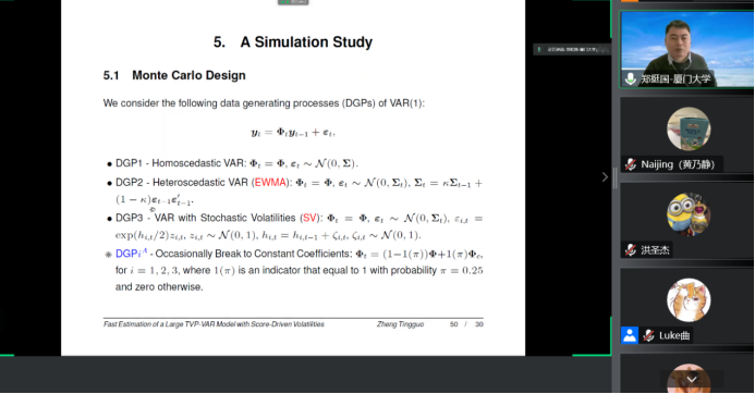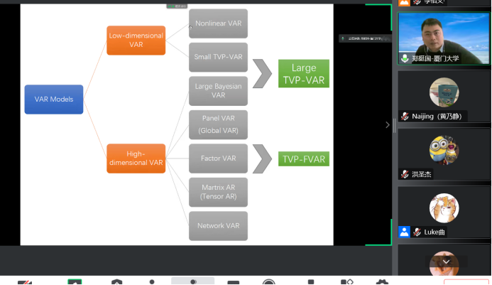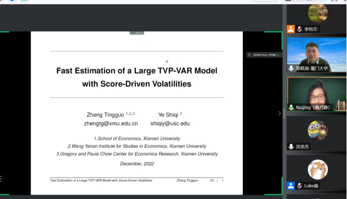2022年12月8日14:00,厦门大学开云kaiyun官方网站和王亚南经济研究院教授、厦门大学特聘教授、博士生导师郑挺国教授应开云kaiyun官方网站开云kaiyun官方网站邀请,进行了主题为“Fast Estimation of a Large TVP-VAR Model with Score-Driven Volatilities”的讲座。本次讲座在线上进行。郑挺国教授受到了开云kaiyun官方网站老师与同学们的热烈欢迎。开云kaiyun官方网站黄乃静副教授主持讲座,洪圣杰副教授参加了讲座。