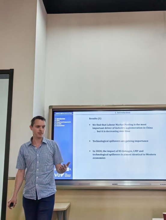 当日上午,Hans先与开云kaiyun官方网站的青年教师围绕着城市经济学,开展了小范围青年座谈讨论,参与学院老师包括戴若尘副教授、吴楠助理教授、方海东助理教授、翟颖佳助理教授。老师们就城市集聚,城市生产与创新网络,城市间的交通成本几大主题分别汇报了最新的研究进展,在讨论中对中国城市经济学相关问题有了更深刻的认识。