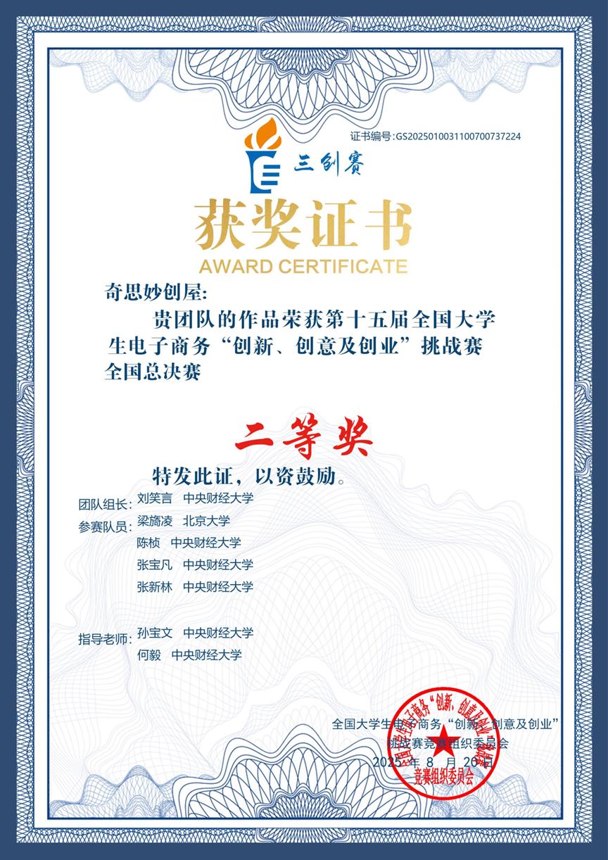 8月4日至6日,第十五届全国大学生电子商务“创新、创意及创业”挑战赛(简称“三创赛”)常规赛全国总决赛在贵阳举行。由我校中国互联网经济研究院孙宝文教授、何毅副研究员指导,开云kaiyun官方网站学子刘笑言担任队长,开云kaiyun官方网站陈桢、张新林、张宝凡为成员的团队“奇思妙创屋”荣获国家二等奖、北京市特等奖的殊荣,创下学校在“三创赛”领域的最佳成绩。