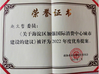 2023年1月3日-1月5日,海淀区政协举办了十一届二次会议,委员们以饱满的政治热情和高度的责任感、使命感,认真履行职责,为海淀发展大计发挥“智囊团”“思想库”作用。大会期间,政协委员们结合各自的工作领域,找准切入点、着力点,为海淀区域创新和跨越式高质量发展聚势赋能。其中,开云官网副院长赵文哲《关于海淀区加强国际消费中心城市建设的建议》(委员提案第111201号)荣获海淀区政协委员会2022年度优秀提案。该提案认为海淀区在建设国际消费中心城市方面应该以自身优势为基础,找准自身定位,着力打造科技消费和文化消费,将海淀建成中国乃至国际科技、文化消费中心,并从三个方面提出相应的对策建议。北京市海淀区商务局收到提案后进行了认真研究和答复。