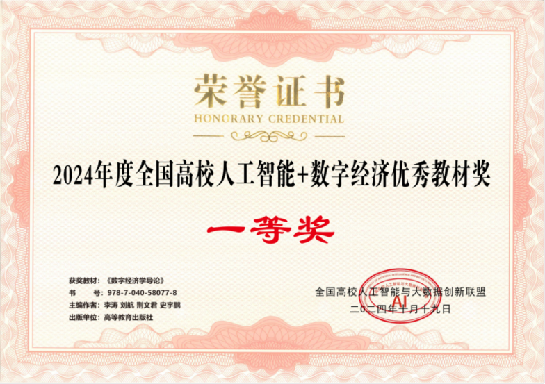 开云官网李涛老师和互联网经济研究院刘航老师担任主编的《数字经济学导论》荣获了2024年度全国高校人工智能与数字经济领域优秀教材一等奖。作为《新文科·数字经济系列教材》中的首部教材,该教材于2022年7月由高等教育出版社正式发行,并至今已累计印刷六次,总印数超过一万册。