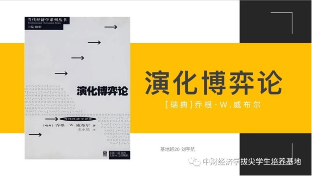 首先,刘宇航同学分享了乔根·W·威布尔的《演化博弈论》,威布尔是斯德哥尔摩开云kaiyun官方网站经济系教授,瑞典皇家理工学院数理统计系加盟教授,瑞典皇家科学院、世界计量经济学会、欧洲经济学会成员。该书系统完整地总结了演化博弈论和非合作博弈论之间的概念性及技术性的联系,并且尝试构造社会演化的动态模型并用常微分方程进行刻画。作者指出:传统观点认为个体的环境是外生给定的,而实际上个体的行为同样受着其他个体的影响,而其他个体同样又受着自然选择力的影响。所以,从个体或企业的最优行为取决于与之互动的总体中行为的分布的角度来说,这同样是一个内生性的问题。威布尔认为,演化博弈论就是要对这种互动背景下的演化性做出分析。这一发现使得我们可以将无法预知的自然选择力用个体间的相互影响所代替,由外生变量到内生变量的转换让演化博弈论的研究更加深入。