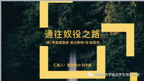 接下来是刘宇航同学汇报了自己对《通往奴役之路》一书的学习情况。该书出版于1944年二战结束之际,作者是英国经济学家、政治学家哈耶克。在书中,哈耶克对实行政府管控的计划经济发出警告,认为此举必将导致集权暴政。他进一步论证,若抛弃个人主义和古典自由主义,将导致自由丧失、社会压迫、独裁暴政以及个人被奴役。哈耶克对当时英国学术界认为法西斯主义(包括纳粹主义)是资本主义对社会主义的抵抗这一观点进行了驳斥。他认为法西斯主义、纳粹主义和传统社会主义拥有诸多共同点,比如都实行中央经济调控、都将国家的地位凌驾于个人之上,等等。哈耶克在书中关于自由的很多论述很具有参考价值,但我们应辩证地看待这些观点,警惕极端新自由主义的“哈耶克陷阱”。