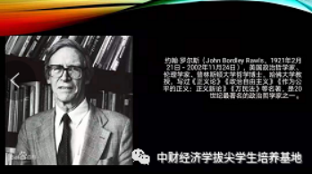 王江涛同学分享了自己对罗尔斯的《正义论》的认识。本书旨在确立一种契约。这里契约目标并非是选择建立某一个特殊的制度或进入某一特定的社会,而是选择一种指导社会基本结构设计的根本道德原则即正义原则。这里,所谓的基本结构就是主要的社会制度所汇合的一个体系,它们分配基本权利和义务,并划分社会合作所产生的利益。政治宪法、法律所确认的财产形式以及经济组织都属于本结构,它是一个决定背景正义的无所不包的社会体系。罗尔斯假设相互冷淡(即不自利、不利他)的作方处在平等地位的原初状态中,并假设各方被看作同时自己也把自己看作是自由和平等的道德的人,而且各方在达成原始协议时对自我、阶级地位或社会地位、财产所有、知识才能等等情况余然未知,即无知之幕(The veil of ignora ance),他们只知道他们的社会是处在正义的环境中,知道政治和经济的理论原则,有关人类社会的一般事实及人们的一般心理。正义原则就是在无知之幕之后选择的。罗尔斯在书中表达了他的政治自由观,罗尔斯的自由不是那种随心所欲的天马行空,而是一种井然有序的社会理想结构;是普天之下人人皆有的基本权利:自由不是依赖于他物的寄生物,被决定者,而是社会基本结构的独立基石、中流砥柱,因此,在罗尔斯那里,平等的自由象征着正义。