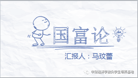 马玟蕾同学对《国富论》的第一章作了详细阐述。《国富论》奠定了资本主义自由经济的理论基础,该书的出版标志着古典政治经济学理论体系的建立。作者亚当斯密认为政治经济学的基本研究目标是“富国”和“裕民”。其中,“裕民”是第一位的,没有民众的富裕,“国富”就成了无源之水。两者皆有赖于国民财富的增加,即首先是把蛋糕做大。那么什么是国民财富以及如何才能增加国民财富便是该书着重解决的两个问题。前者涉及的是国民财富的性质问题,后者涉及的是国民财富增进的原因。如何才能增进一个国家的国民财富?斯密认为,国民财富的增加主要有两条途径和一个保障:途径之一是提高劳动生产率,它主要依赖于分工的深化和市场交换过程的顺畅;二是增加劳动者人数,而这又依赖于资本积累和适当的资本运用。在这个过程中,坚持经济自由、充分发挥市场这只“看不见的手”的作用、取消政府的不适当干预、让经济活动依其天然秩序运行是最根本的制度保障。政府干预和管制的主张在重商主义达到了登峰造极的程度,斯密以七章的篇幅对重商主义的学说和各种干预措施加以批判。在抨击重商主义的过程中,斯密提出了“看不见的手”的观点。在斯密看来,在自然自由的制度下,每一个人都从自己的利益出发从事生产经营活动,在这个过程中,受看不见的手的指导去追求自己的利益,往往使他能比在真正出于本意的情况下更有效地促进社会的利益。自然自由制度和经济自由主义,是令“看不见的手”充分发挥效力的重要保障。