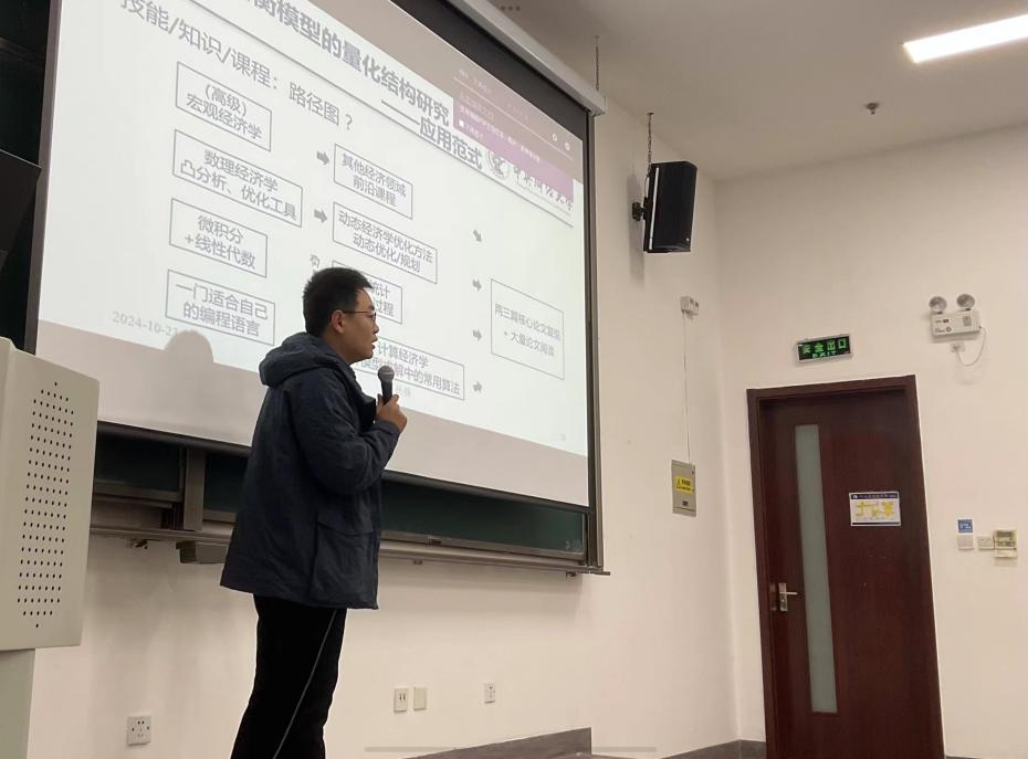 10月23日,开云kaiyun官方网站数字经济时代经济学拔尖学生培养基地班“科研基础训练”课程第四讲在沙河校区主教106教室正式举行,开云kaiyun官方网站开云kaiyun官方网站赵扶扬副教授为同学们带来以“理论模型研究范式简介”为主题的讲座。赵扶扬副教授从如何看待经济学研究方法展开,为我们介绍了当今经济学界各种主流的基于理论模型的研究范式,最后落脚于基于一般均衡模型的量化结构研究的具体办法,让同学们建立起对经济学研究方法的系统性认识,以及了解如何精进自身,更好地掌握应用各类研究方法。